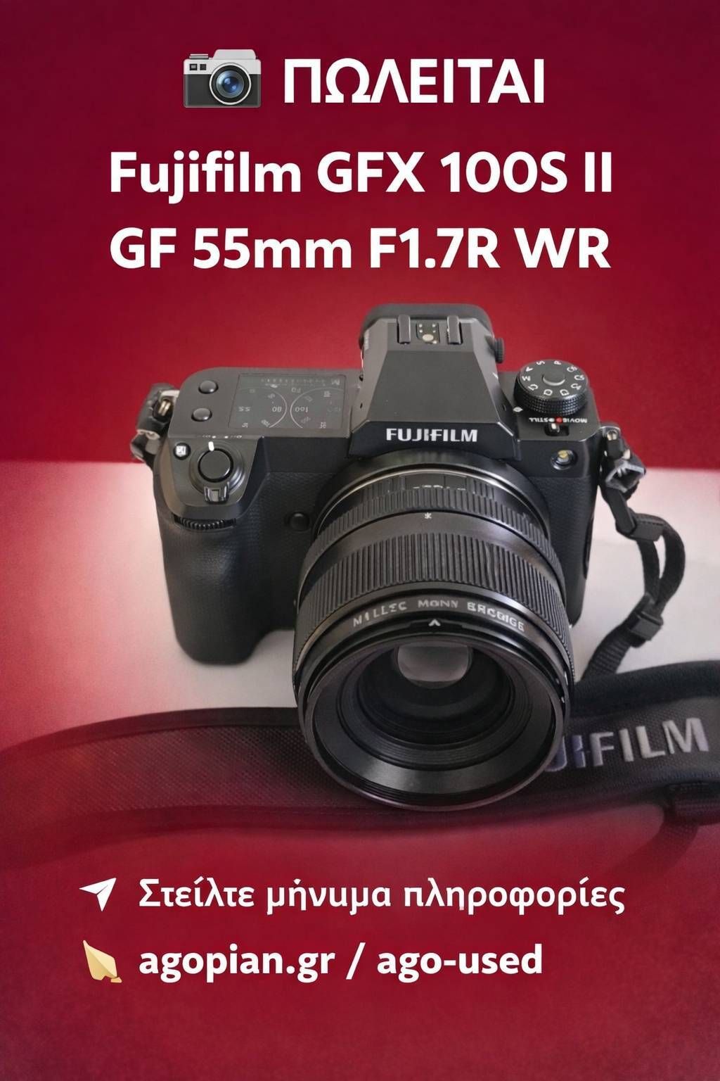 "📸 *ΠΩΛΕΙΤΑΙ! Στην αναζήτηση της τέλειας φωτογραφικής μηχανής;* 🎉 Προτού προχωρήσετε σε οποιαδήποτε αγορά, δείτε αυτήν την ευκαιρία! Πωλείται η **Fujifilm GFX 100S II** μαζί με τον κορυφαίο φακό **GF 55mm F1.7R WR**! 🌟 Η κατάσταση της μηχανής είναι σχεδόν καινούρια, αποκτήθηκε μόλις πριν από έν...Read more